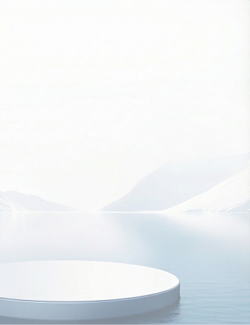 3D玻璃风立方体漂浮于静谧湖面,几何切割折射清透光感,虚拟自然与清爽雪山倒影交织,营造空灵静谧的极境美学。