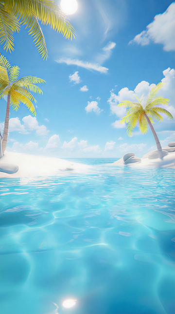 超写实风格的海面背景,清澈透明的渐变蓝色海水,水面波光粼粼,阳光透过海水形成明亮的光斑和折射纹路,远处海天相接,天空中漂浮着蓬松的白色云朵,整体画面呈现出宁静、通透、充满光泽感的氛围,光影效果细腻,色彩和谐统一,海水质感真实,波浪纹理自然流畅。