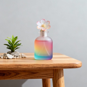 高清摄影风格,透明玻璃香水瓶,瓶身呈方形略带弧度,内装淡粉色液体,银色金属喷头与圆形透明瓶盖,瓶身置于柔和褶皱的浅粉色丝质布料上,布料上散落着几朵白色盛开的花朵,背景为渐变的浅蓝色调,带有柔和的光线斜射形成的光斑和阴影,整体营造出清新、优雅、浪漫的氛围,光线明亮柔和,突出香水瓶的透明质感与液体的色泽,画面构图简洁,主体清晰,细节丰富,具有高端香水广告的精致感与视觉吸引力。