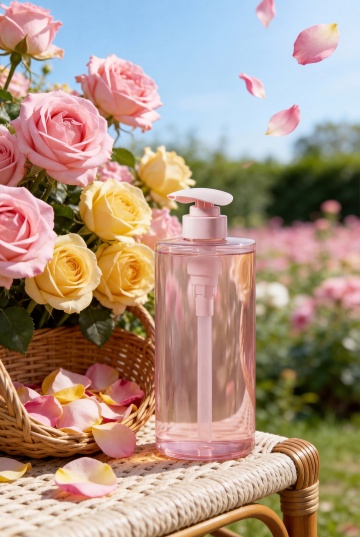 梦幻感与清新感交织,3D风呈现玻璃质感瓶身,重拟物风格还原水珠细节,虚拟自然场景中粉玫瑰环绕,水彩风渲染柔美光影,唯美感与浪漫感满溢,适配春日节日氛围。