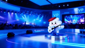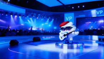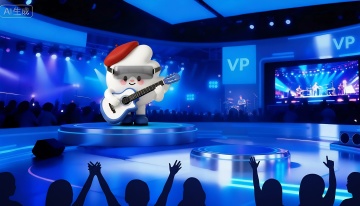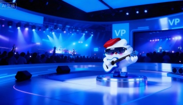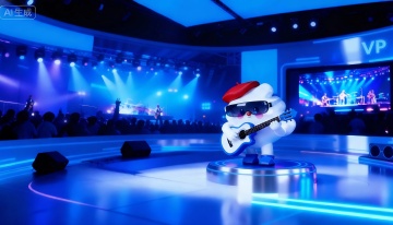 梦幻软3D风,霓虹灯色彩斑斓,音乐符号飘动,吉他演奏如梦似幻。