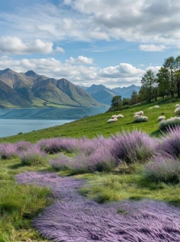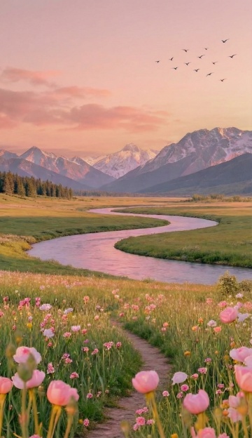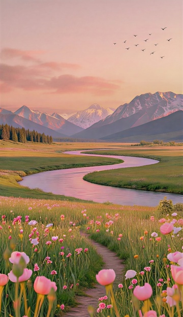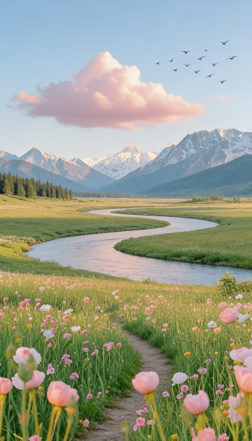 全景镜头,晨曦微露时分的山谷秘境,薄雾如轻纱般在翡翠色的草甸上流动,蜿蜒的银色溪流如时间的脉络穿行其间,两岸点缀着露珠闪烁的白色小花,远处靛青色的山峦轮廓在紫粉色的朝霞中若隐若现,水面倒影与实景交织成梦幻的双重世界,空气中弥漫着湿润的草木气息,光线柔和得如同被滤过一般,细节丰富的3D渲染质感中透着水彩画般的诗意朦胧,整体色调呈现出青绿色与玫瑰金的渐变融合,营造出神秘而又充满希望的黎明之境。