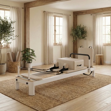 写实风格室内场景,明亮自然光从左侧窗户洒入,木质地板与浅灰色墙面形成温馨家居氛围,年轻女性扎着马尾辫,穿着白色背心和深灰色运动裤,正在做瑜伽鸽子式动作,身体侧俯,右腿弯曲膝盖着地,左腿向后伸直,双手撑地保持平衡,面带微笑,瑜伽垫上放着一台打开的笔记本电脑,背景有绿色植物、灰色布艺沙发和白色书架,整体色调柔和,光影过渡自然,画面构图采用三分法,人物位于中央偏右位置,营造出健康活力的居家运动场景。