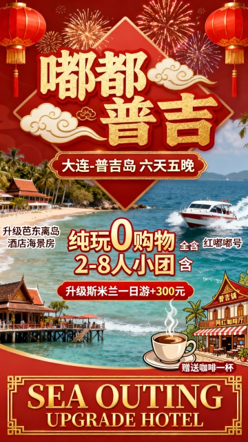做一张 酒店升级 快艇出海 赠送咖啡 贺岁普吉 大连-普吉岛 六天五晚 纯玩0购物 全含 2-8人落地散拼团.升级斯米兰一日游+300元 SEA OUTING 红嘟嘟号快艇出海皮皮岛+帝王岛一日游 UPGRADE HOTEL了 2晚升级芭东离岛酒店舒适惬意、安静悠闹的度假时光 COFFEE SHOP普吉镇特色网红咖啡厅赠送咖啡一杯 要春节系列风格高大尚的海报宣传图