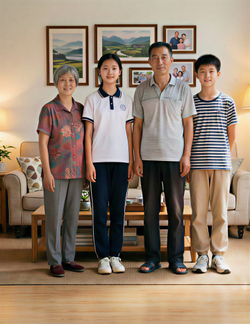 温暖柔和的晨光透过木质窗棂洒入室内,照亮了一对老年夫妇的背影,老先生穿着浅色衬衫,戴着眼镜,左手轻轻搭在身旁穿着碎花上衣的老太太肩上,两人依偎着望向窗外,窗外可见翠绿的树枝,室内窗台上摆放着古朴的陶瓷茶壶、茶杯和一盆红色花卉,整体画面呈现出温馨、宁静、岁月静好的氛围,光影层次丰富,色调温暖偏黄,具有高度写实的质感和细腻的细节刻画。
