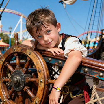 一张全景照片,一个 6 岁亚洲男孩,正面,笑脸,戴着米色帽子,白色和黄色的 T 恤,蓝色短裤和蓝色和黄色的运动鞋,带着黄色的风筝奔跑,在绿色的田野上,背景是湖泊,蓝天,明亮的阳光交融
