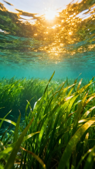 一幅梦幻唯美的海底世界插画,整体采用深蓝色调为主,搭配青色和浅蓝色的渐变,营造出神秘而宁静的氛围。画面中,阳光不再从水面上方直射,而是转变为从画面右侧斜下方照射的柔和光源,光线穿透海水形成一束束倾斜的光柱,在水中折射出斑斓的光晕效果。海底的细沙呈现出细腻的质感,上面覆盖着一些绿色的海草和形态各异的珊瑚礁。一群银色的小鱼正朝着光源的方向游动,它们的身体在光线下闪烁着微光。画面中还点缀着许多大小不一的气泡,从海底缓缓上升。整体构图采用纵深视角,前景的珊瑚和海草清晰可见,中景的鱼群和背景的海水形成了明显的层次感,光线的变化让整个海底世界呈现出一种全新的光影魅力,既保留了原有的梦幻感,又增添了一丝温暖和神秘感。