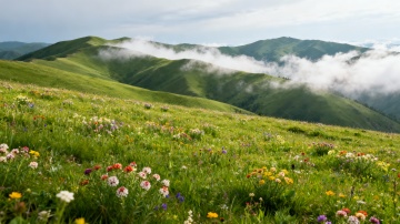 在一片广袤无垠的草原上,远处是巍峨耸立的雪山,山顶覆盖着皑皑白雪,山腰处云雾缭绕,宛如仙境。草原上绿草如茵,点缀着五颜六色的野花,有红色、黄色、紫色等,在阳光的照耀下显得格外鲜艳。近处有几棵高大的树木,枝叶茂盛,投下斑驳的光影。天空湛蓝,飘着几朵洁白的云彩,整个画面给人一种清新、自然、宁静的感觉,充满了生机与活力。