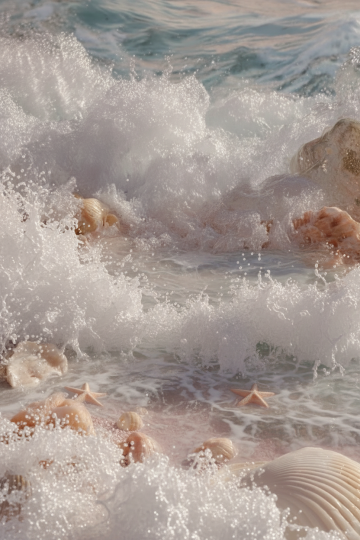 从空中俯瞰视角,清澈碧蓝的海水在阳光下波光粼粼,呈现出由浅至深的渐变蓝色调,层层叠叠的水波荡漾,形成柔和的曲线纹理,海浪轻轻拍打着下方金黄色的沙滩,沙滩上散落着几个白色和浅粉色相间的贝壳,天空湛蓝,漂浮着几朵蓬松的白云,阳光明媚,光线充足,营造出宁静、清新、治愈的夏日海滩氛围,整体画面具有超写实的质感,色彩鲜明和谐,光影效果自然,细节丰富,给人一种开阔、舒适的感觉。