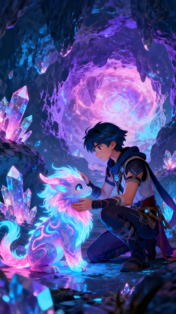 帮我生成20张手游壁纸,整体以蓝紫粉为主色调,呈现华丽梦幻、科幻元素的二次元游戏美术宣传风格。