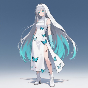 侧视构图,在一座被月光浸透的古老神社鸟居下,一位身着改良巫女服的少女正跪坐在漂浮的和纸灯笼上,她的银白色短发上系着朱红色的发带,几缕发丝被夜风吹起,发间别着一朵半开的黑色山茶。巫女服以墨色为底,领口和袖口绣着渐变的荧光蓝蝴蝶纹样,腰间系着深红色的蝴蝶结,裙摆下露出一截白皙的小腿和木屐。她的手中握着一支正在滴落星光的毛笔,笔尖触及之处,水面上便绽放出淡蓝色的符文涟漪。周围环绕着十二只形态各异的狐狸式神,有的通体雪白,有的毛色漆黑,眼睛都散发着幽幽的蓝光。背景是被薄雾笼罩的日式庭院,石灯笼散发着温暖的橙光,远处是连绵的黑色山峦轮廓和一轮巨大的血月,水面漂浮着散落的樱花花瓣和燃烧的线香灰烬,色调是神秘的靛蓝与朱砂红的交织,光影在巫女服的丝绸面料上形成柔和的漫反射。