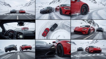 雪域飙车,红黑超跑竞速对决,3D实景感与金属光泽交织,动感十足的现代科技风,展现极致速度与奢华冲击。