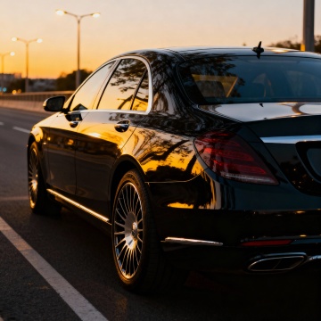 写实摄影风格,一辆红色轿车在公路上行驶,车头朝向画面左侧,车身呈现出流畅的线条和金属质感。背景是壮丽的日落景象,天空中布满了橙红色的云彩,阳光从云层中穿透出来,在地面上投下长长的光影。公路两旁是茂密的森林,树木呈现出深绿色,与天空的暖色调形成鲜明对比。整体画面色彩浓郁,光影效果强烈,营造出一种动感和速度感,同时又带有一丝宁静和壮丽的氛围。