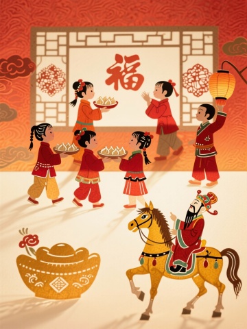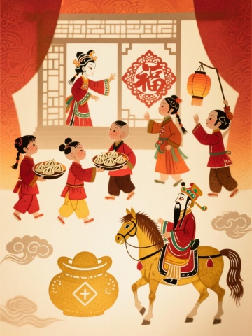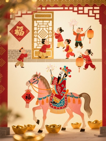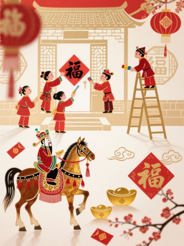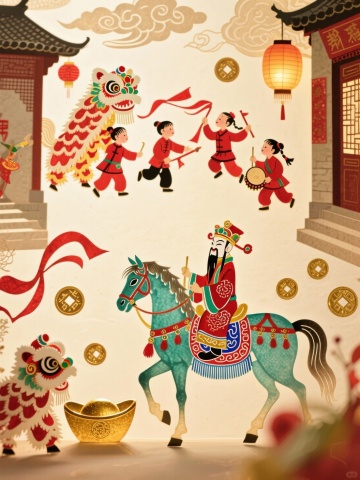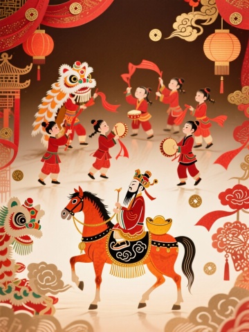 以大红色为底色(契合中国年氛围),元素密集且色彩浓郁,传递 “过大中国年” 的热闹感。 核心元素: * 文字:顶部巨型艺术字 “马年吉祥”(字体融入人物装饰),下方英文 “Great luck in the Year of the Horse.”、中文 “过大中国年” * 形象:包含传统戏曲人物(如武生、旦角)、装饰性建筑(亭台)、民俗场景(抬龙灯的孩童、骑马的老者)、瑞兽(彩绘龙、纹样华丽的神兽)、交通工具(马车),还有竹子等中式植物元素;排版上马再图片比例偏大 * 色彩:形象以绿、蓝、金、紫等高饱和色彩绘制,搭配黑色线条勾勒轮廓,与红色底色形成强烈撞色,符合传统民俗艺术的视觉特点。新春民俗主题,细节丰富、色彩浓烈,既有中国传统文化的厚重感,又有节日的热闹喜庆,适配新春活动、文化宣传类海报创作。高清图片