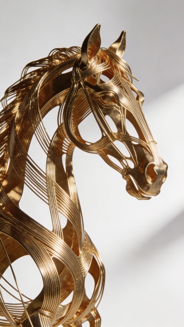 鎏金线条勾勒的3D金属骏马,融合未来感与奢华美学,立体主义结构展现虚拟自然的流动之美。