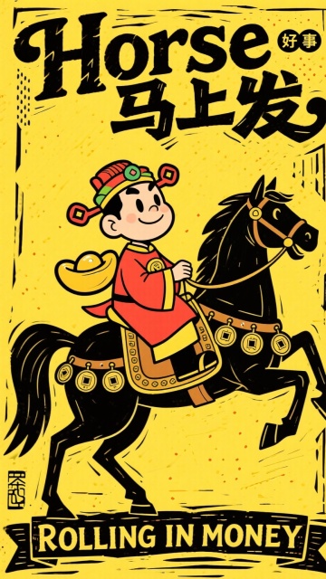 卡通风格新年插画,红色纯色背景,画面中心是棕色卡通小马,小马身上坐着穿黄上衣蓝裤子的卡通小人,小人双手举着大金元宝,福袋旁有放射状线条装饰,小马周围散落金元宝、铜钱,左侧有星星闪光元素。小人旁的云朵对话框写着“马上有钱”,字体为手写卡通体,画面底部有手写英文“Rich new year!”。整体用粗黑轮廓线勾勒,色彩以大红、明黄、棕色为主,高饱和度对比强烈,构图居中对称,风格可爱童趣,充满新年招财的喜庆氛围,元素简洁夸张,线条圆润无棱角。