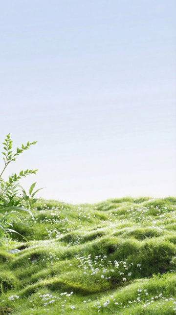 广阔的蓝天占据画面大部分区域,下方是连绵的青草地,几朵白云点缀在蓝天上,整体画面简洁清爽,水彩画风格,色彩明快柔和,可作为背景使用。