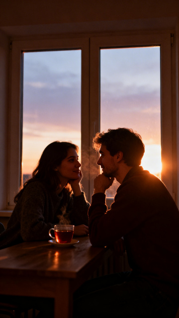 温馨插画风,拟人卡通女孩与真人共饮咖啡,营造节日般温暖氛围。