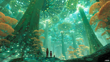 梦幻插画风,清新虚拟自然,超现实主义森林,光影交织,生机盎然。
