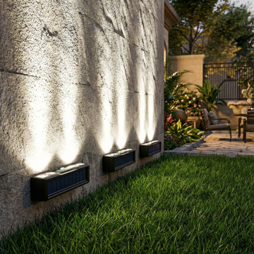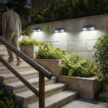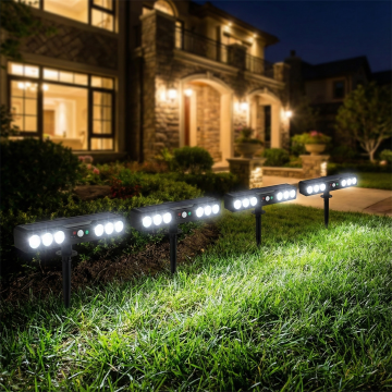 这个是多个角度的产品,有三个产品插在草坪里,产品对着楼梯亮白光 场景是,楼梯的一边是墙,一边是产品插在草坪里,产品对着楼梯,照亮楼梯,楼梯上面是别墅,