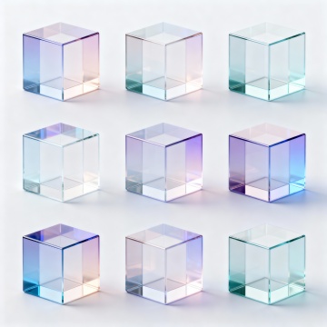 科技感与未来感交织,清透玻璃立方体以几何形态堆叠,3D立体呈现体积感,简约主义风格尽显纯粹之美。