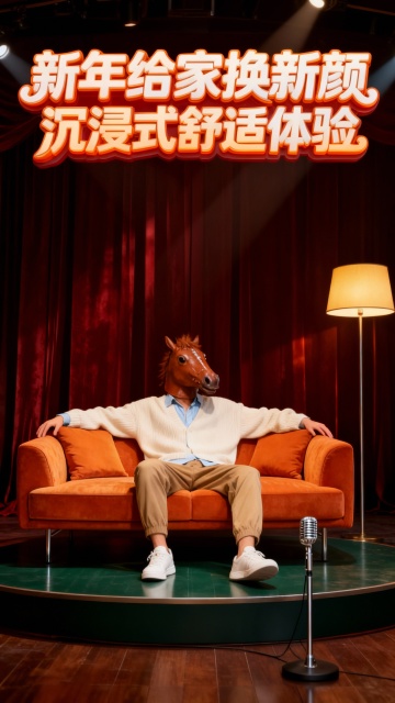 温馨明亮的现代公寓客厅,清晨阳光透过大落地窗。一匹拟人化的枣红色骏马,身穿高级灰运动服,正在一台设计极简的哑光黑色家用跑步机上从容健走。戴着无线耳机,手扶杆。跑步机面板显示数据,氛围灯柔和。旁边有绿植、地毯与沙发。电影感生活场景,光影细腻,色调温暖(米白、原木、浅灰),突出产品与家居的和谐感。主体文字“马年大吉,健步启程!”文字带有设计感。角落一行小字“春节不打烊”。画面比例9:16