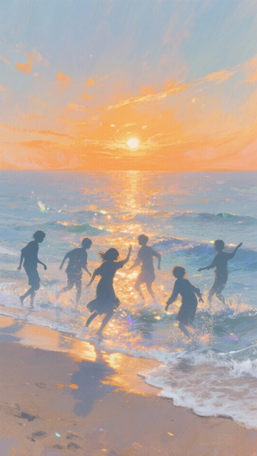 剪影风插画,夕阳海面光影交织,人物奔跑剪影洋溢温馨浪漫,水彩质感与印象派笔触融合,梦幻氛围满溢。