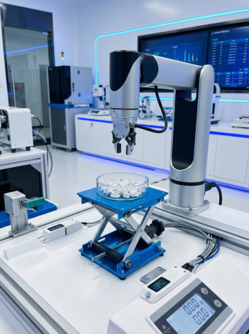 现代化高科技实验室场景,画面干净规整,适合作为背景。明亮的白色与蓝色调为主,洁净的白色墙面镶嵌着深蓝色方块瓷砖,地面为光滑的浅灰色。前景有两位身着全套白色防护服、佩戴护目镜和口罩的科研人员,一位正坐在操作台边专注查看电脑屏幕,另一位站立于大型精密仪器前操作控制面板。实验室中央和后方分布着多台先进的白色与银色相间的分析仪器、设备,带有蓝色显示屏和控制面板,仪器间有金属管道和电缆有序连接。右侧有机械臂装置,左侧前景有透明玻璃容器和绿色植物点缀。整体光线均匀柔和,以冷色调为主,营造出专业、严谨、先进且一尘不染的科研氛围,构图平衡,空间感强,视觉层次分明,信息传达清晰,符合高科技科研环境的审美与功能需求。