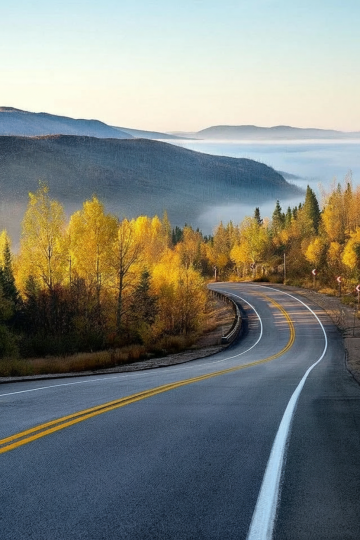 一条蜿蜒的沥青公路,路面上画着两条醒目的黄色分隔线,公路两旁是茂密的森林,有高大的松树和一些低矮的灌木。远处是雄伟的雪山,山顶覆盖着皑皑白雪,在阳光的照射下,雪山呈现出金黄色和橙色的光辉。天空湛蓝,飘着几朵淡淡的云彩,营造出一种宁静而壮丽的自然景观氛围。