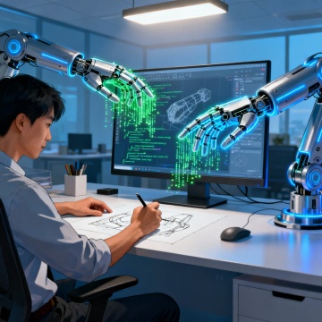 未来科技感十足的场景,深蓝色调为主,带有明亮的蓝白色发光元素,光影对比强烈,光线从机器人手指和笔记本屏幕散发出来形成光晕效果。一个人正在使用笔记本电脑,他的手放在键盘上,另一只半透明的机器人手从上方伸出,手指指向屏幕上的全息界面。周围悬浮着多个半透明的全息数据窗口,包含各种图表(折线图、柱状图、饼图)、仪表盘、圆形和方形的控制面板元素,界面线条流畅,带有科技感的蓝色发光边框。背景深邃模糊,突出前景的手部、笔记本和全息元素,整体营造出高科技、数字化、未来感的氛围,具有清晰的视觉层次,主体元素突出,细节丰富,画面具有电影感的景深和质感。