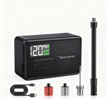 专业产品摄影风格,1:1正方形构图,俯视角度拍摄。画面中央是图二的充气泵主机,充气泵主机左侧放置着图三的充气管,右侧有一根黑色的USB充电线跟图一的气嘴适配器。整体光线均匀柔和,采用影棚灯光设置,产品表面有细腻的反光效果,黑色塑料外壳呈现哑光质感,黄色部件有鲜艳的色彩对比,金属部件有金属光泽。色调以黑色、黄色、白色、红色为主,浅蓝色背景形成简洁的色彩搭配。景深控制精准,所有产品都清晰锐利,表面反射柔和自然。
