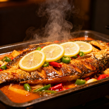 一张白色圆形瓷盘盛放的中式菜肴,菜品色泽红亮诱人,表面覆盖光泽感的酱汁,点缀细小的红色辣椒碎,食材形态自然堆叠,具有清晰的质感和细节,纯色白色背景,简约现代风格,整体构图规整居中,无任何文字、logo或水印