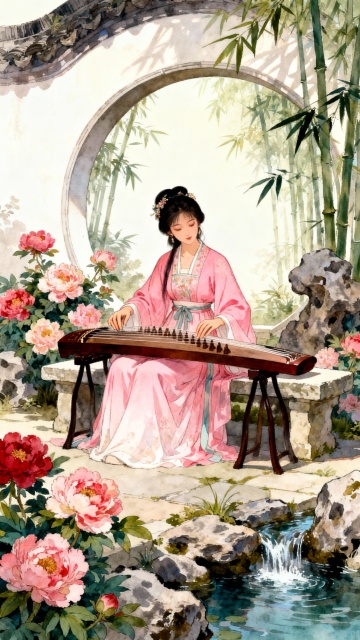 工笔风与插画风融合,古典中式美人执扇临窗,光影交织,莲影婆娑,尽显优雅浪漫与静谧唯美感。