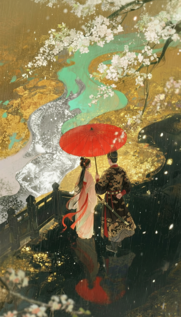 水墨风与工笔技法交融,雨中仕女执伞立于池畔,亭台倒影朦胧,古典中式意境悠然,静谧唯美的插画风格尽显文艺诗意。