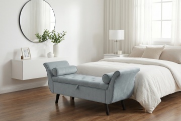 一张现代简约风格的卧室设计图,整体色调为温暖的米白色和浅木色,搭配柔和的自然光线从大窗户洒入,营造出宁静舒适的氛围。房间内有一张铺着白色条纹床单的双人床,床头摆放着简约的床头柜和台灯,床尾处铺着一张米白色的地毯。房间的另一侧是一个白色的梳妆台,上面摆放着一些绿植和装饰品。墙面采用了简约的线条设计,整体空间布局合理,家具摆放整齐有序。