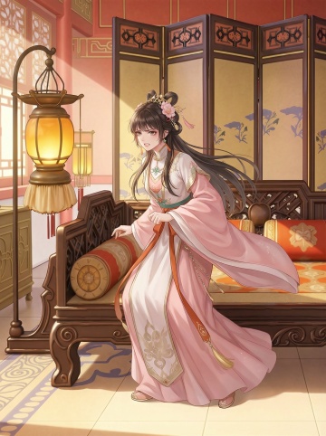 工笔风与插画风融合,古典中式美人执扇临窗,光影交织,莲影婆娑,尽显优雅浪漫与静谧唯美感。