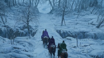 梦幻插画风,男孩骑马射箭,彩虹环绕,虚拟现实与超现实主义交融。