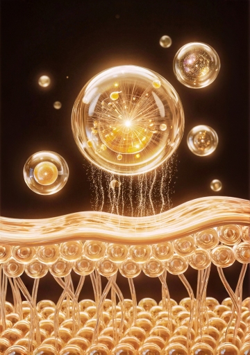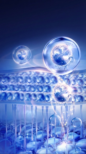 一张具有科技感和护肤概念的3D插画,画面以纯净的浅蓝色和透明感为主色调,营造出清新、水润、充满活力的氛围。底部是一层半透明的粉色肌肤质感表层,肌肤表层下方是密集排列的、如同透明水珠般的细胞结构,细胞之间有细长的蓝色透明管状结构延伸。肌肤表层上方,有大小不一的透明水泡悬浮,大水泡表面有细微的反光和内部气泡,小水泡点缀其间,整体光影柔和,高光细腻,透明感极强,展现出深层补水、肌肤水润饱满的视觉效果,构图简洁大方,主体突出,具有高度的视觉吸引力和信息传达效率,符合护肤品广告的设计感和目标受众对水润肌肤的审美期待。