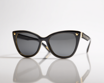 简约现代风格的墨镜产品图片,纯黑色背景,中央规整排布一副墨镜,墨镜为多边形镜框设计,镜框为金色金属材质,镜片为纯黑色,镜腿末端为黑色,整体造型简洁利落,无任何文字、logo和水印,光线均匀柔和,突出墨镜的线条感和材质质感。