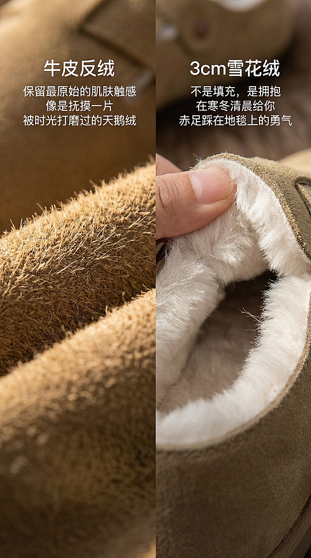 视觉: 产品旁摆放几样氛围物品:一小捆肉桂卷、一杯手冲咖啡的热气、一副羊毛手套、一本皮质笔记本。强调温暖、内敛的秋冬感。 文案: 它的季节,是深秋到初春。 副文案: 羊羔绒内里的使命,便是隔绝寒意,留存体温。详情