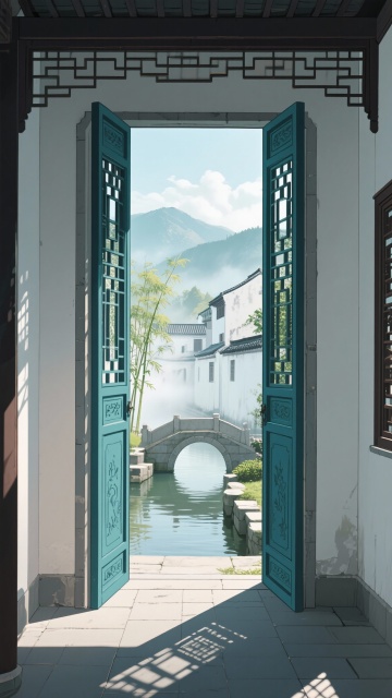 二次元古风,古城,江南烟雨,古街上,构图夸张,浅绿色,浅灰色,细节丰富,不要人物,生成2张,16:9