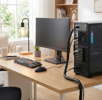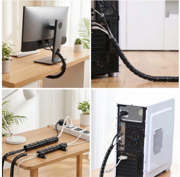 保留图中的理线管,还是以四宫格的形式,生成电商的使用场景图,更换背景场景