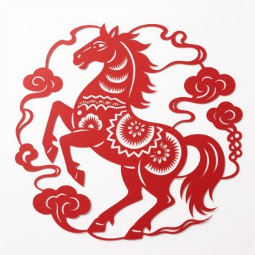 红色剪纸风骏马图,融合民族与国潮元素,单色设计凸显中式喜庆感,祥云环绕,寓意吉祥如意。