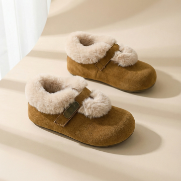 构图: 正方形画布,产品采用对角线构图,一只鞋在前(左下区域),一只鞋略靠后在上方,形成前后错落感。产品整体占据画面约60%。 视觉焦点: 左下角的前鞋为主视觉点,鞋口朝向画面中心,确保能清晰看到鞋款完整外观与内部的毛绒内里细节。 背景与光线: 浅米色或浅灰色哑光背景纸,左侧窗边自然光模拟,光线柔和,在鞋面产生细腻的明暗过渡,突出皮革质感与毛绒的柔软。 元素与留白: 画面极其干净,无任何多余装饰。在左下角主鞋下方预留明显空白区域,用于您添加“送赠品”文字和小图标。 画面感觉: 安静、聚焦、充满细节质感,让人第一眼就能感受到产品的材质与工艺。