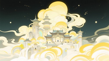 二次元古风,梦境,云上,宫殿门口,构图夸张,浅黄色,浅白色,细节丰富,素材丰富,不要人物,生成2张,16:9