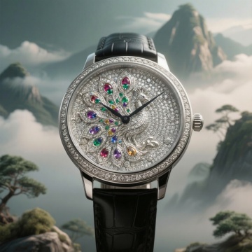 奢华感与梦幻感交织,3D浮雕孔雀镶嵌彩宝,金属质感与重拟物设计融合中式意境,唯美感与优雅感尽显,背景云雾山峦如仙境。