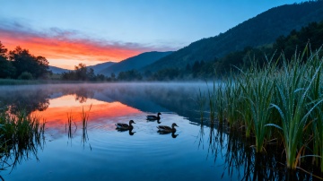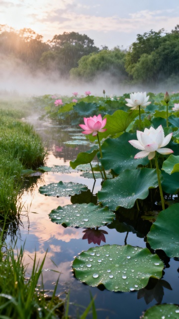 梦幻水彩风,清新荷花池,柔和色彩交织,印象画派夕阳美景。