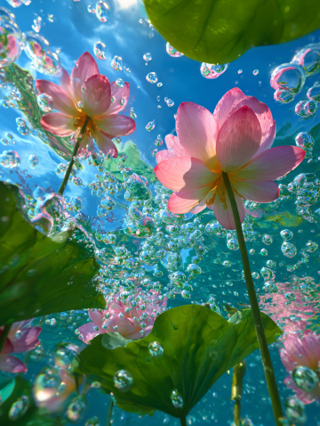 梦幻水彩风插画,粉荷映夕照,静谧湖面泛柔光,虚拟自然中的唯美诗境。