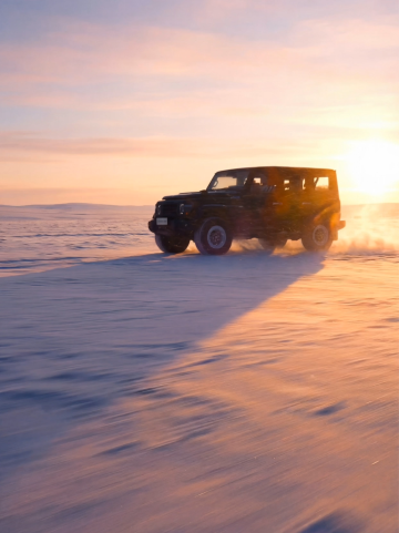 极寒雪原上的黑色越野车在落日余晖中疾驰,实景感与光影感交织,展现现代工业美学的酷炫与体积感,3D风重拟物设计强化动态张力。