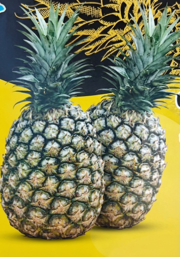 超高分辨率摄影,变换布局的新鲜菠萝特写,多个完整菠萝与切片菠萝以新的排列方式紧密组合,金黄饱满的菠萝果实带有清晰的螺旋纹理和褐色果眼,切面展示明亮的黄色果肉与放射状纤维结构,翠绿带刺的菠萝叶带有自然水滴,整体色彩以暖黄色为主调,搭配绿色叶子形成鲜明对比,顶部视角俯拍,光线从上方柔和照射,突出菠萝表皮的光泽感与果肉的多汁质感,背景虚化处理,聚焦菠萝主体,营造出新鲜、饱满、充满热带水果活力的氛围,细节丰富,纹理清晰,色彩鲜艳,构图紧凑且富有层次感。